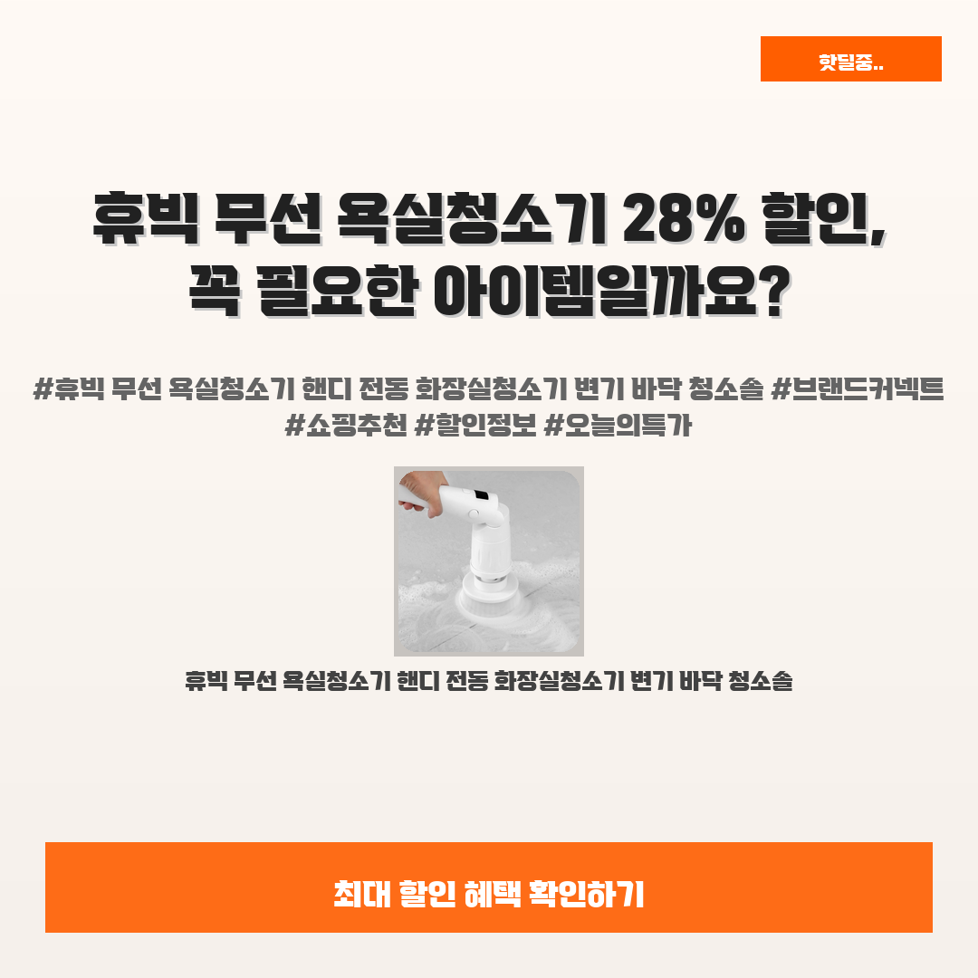 🛍️ 이 포스팅은 네이버 쇼핑 커넥트 활동의 일환으로,판매 발생 시 수수료를 제공받습니다.오늘 소개할 제품은 단연코,,바로 휴빅 무선 욕실청소기입니다!집에서 청소하는 게 항상 귀찮으신가요? 특히 욕실 청소는 정말 어렵고 고된 일이죠. 그런데 이 제품이 있다면 그 고민, 어떻게 해결할 수 있을지 궁금하시죠?휴빅 무선 욕실청소기는 변기와 바닥 청소를 손쉽게 도와주는 핸디 전동 청소솔이에요. 이제는 힘들게 비품을 드는 대신, 스마트하게 청소할 수 있는 기회를 놓치지 마세요!한정된 시간에 28% 할인된 가격으로 만나볼 수 있으니, 이 기회를 통해 여러분의 청소 스트레스를 확 줄여보세요!※ 이거 진짜 제가 직접 써보고 쓰는 리뷰예요 광고 아님!!휴빅 무선 욕실청소기 핸디 전동 화장실청소기 변기 바닥 청소솔28%..